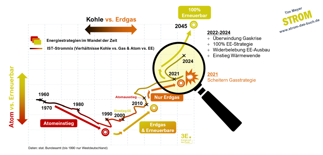 Die zweite „Energiestrategie“ ab 1990 hieß „Erdgas und Erneuerbare“, war damit aber nicht so recht auf Klimaneutralität ausgerichtet. Ab 2012 werde der Ausbau der Erneuerbaren gebremst und der Gasanteil hochgefahren – bis diese Strategie 2021 mit dem Angriff Russlands auf die Ukraine ein jähes Ende fand. Von 2021 bis 2024 fand ein massiver Richtungswechsel statt: Kurs 100% Erneuerbare.