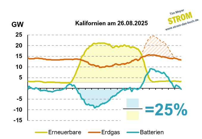 In Kalifornien wird regelmäßig bereits ein Viertel der solaren Mittagsspitze zwischengespeichert. Dieser Strom verdrängt dann abends Erdgasverstromung aus dem Markt. Die Grafik zeigt das für einen Tag mit hoher Solarstromerzeugung, den 26.08. 2025. An Tagen mit weniger Sonne werden bereits de als 30% zwischengespeichert.