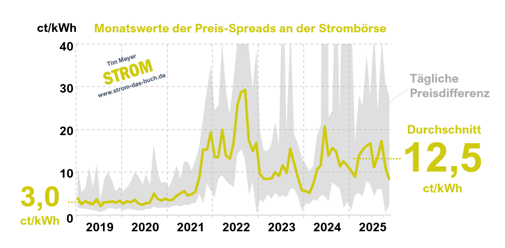 Durch den Ausbau der erneuerbaren Energien sind die Preistäler heute tiefer, Strom bei viel Sonne oder Wind also günstiger als 2019. Und durch stark gestiegene Gas- und CO2-Preise ist Strom bei wenig Wind und Sonne deutlich teuerer geworden: er stammt dann aus teuren Gaskraftwerken. Im Ergebnis ist der Spread im Jahr 2025 auf über 12 ct/kWh gestiegen. Reichlich Anreiz für Investitionen in Flexibilisierung von Lasten und Speicher.