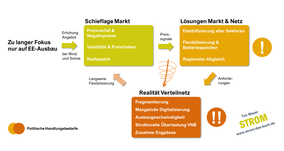 Das Problem im Stromsektor ist nicht der schnelle Zubau der Erneuerbaren Energien. Es sind auch nicht der Verfall von Marktwerten für EE-Strom, die zunehmenden Negativpreise oder die hohe Volatilität, die als Preisrisiko den Strom für Verbraucher verteuert. Das Problem ist vielmehr, dass der Markt all die daraus folgenden Preissignale nicht ausreichend aufnehmen und in Investitionen umsetzen kann. Zum einen, weil Regulierung zu viele Fehlanreize setzt (Netzentgeltstrukturen, Preisniveaus Gas vs. Strom für Wärme etc.) oder Hürden in den Weg stellt (Netzanschlüsse Batteriespeicher etc.).