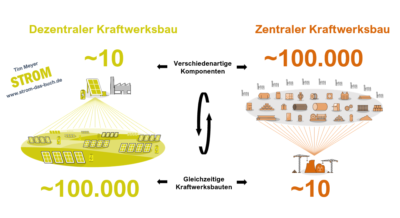Bei zentraler Kraftwerkstechnik ist all dies exakt umgekehrt – besonders extrem bei Nukleartechnik. Hunderttausende verschiedenartige Teile müssen einzeln entwickelt, gefertigt und sicherheitsgeprüft werden. Mit viel Spezial-Know-How werden diese vorkonfektioniert und auf wenigen gleichzeitigen Baustellen zu Kraftwerken zusammengesetzt. Das dauert ~15 Jahre. Betriebserfahrung und Lernen findet entsprechend langsam statt.