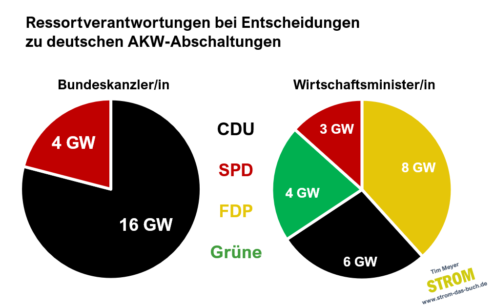 Im jeweils federführenden Wirtschaftsressort fiel die Mehrheit der Abschaltungen sogar in die Zeit von FDP-Ministern. In die Zeit eines grünen Ministers fielen die letzten 4 GW AKW-Abschaltungen.
