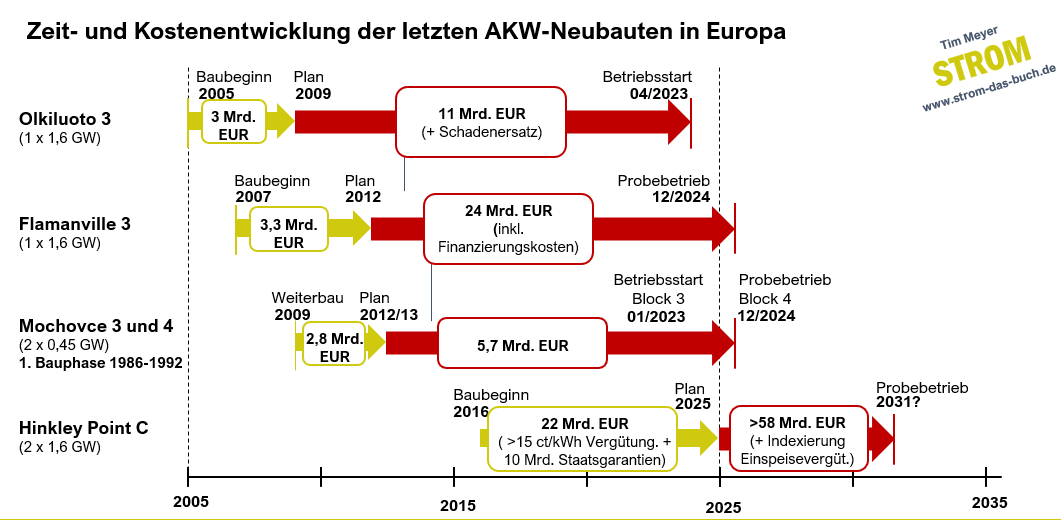 Wer die Ziellinie Klimaneutralität als Erstes überschreitet, ist dennoch nicht ausgemacht. Denn auch der französische Weg geht nicht nur geradeaus. Die AKW-Flotte ist alt und Neubauten dauern ewig (alleine für ein einziges AKW in Frankreich >20 Jahre). Und sie verschlingen gigantische Summen Geld (Flamanville, Hinkley Point C…). Dabei braucht auch in Frankreich die Elektrifizierung von Industrie und Mobilität zusätzliche Strommengen.