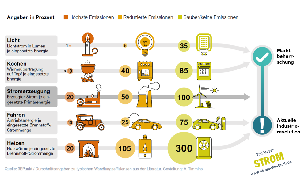 Denn der Wirkungsgrad ist nicht politisch. Am Ende gewinnt immer die Effizienz, weil sie Kosten senkt und mehr Leistungsfähigkeit ermöglicht. Ganz nebenbei schonen niedrige Emissionen dann auch die Gesundheit. Auch wenn viele der in der Grafik angedeuteten Veränderungen aus heutiger Perspektive banal wirken: es waren oft Revolutionen mit tiefgreifenden Auswirkungen auf die jeweilige Wirtschaft und den Alltag der Menschen. Ganze Branchen wurden abgeschafft oder in Nischen verbannt, vom Stellmacher bis zum Kutscher, vom Kerzenmacher bis zum Treidelknecht.